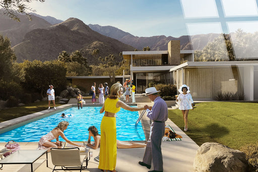 Classy LivingStep into a sunlit world with 'Retro Oasis,' capturing a lively poolside gathering against a backdrop of majestic mountains. This vibrant photograp...