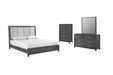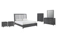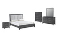 Transform your bedroom into a sanctuary of sophistication with the Odessa Bedroom Set. Crafted from durable Pine solid wood and Mindy veneers, this set promises longevity and resilience. The rich finish, applied through a meticulous multi-step process, enhances the natural beauty of the wood, elevating the ambiance of your space. Featuring heirloom-quality drawer construction with English and French dovetail joinery, full extension glides, and felt-lined top drawers, each piece offers both durability and luxury. The stately headboard boasts a plush gray fabric insert crafted from 100% polyester, ensuring a cozy lounging experience, while LED accent lighting adds a serene ambiance. With its transitional design and ample storage options, including felt-lined top drawers to protect delicate items, the Odessa Bedroom Set effortlessly complements any decor style, making it a versatile addition to your home.