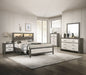 Embrace the harmonious blend of minimalist design and rustic appeal with this captivating bedroom collection. The sleek, low-profile bed is a modern take on farmhouse style, featuring a plank-style headboard with built-in lighting that adds warmth and convenience. Accompanying the bed are the clean-lined dresser and mirror, a chest, and a nightstand, all finished in a distressed wood tone that highlights the grain and character of the material. Contrasting white drawer fronts with simple, yet elegant, metal pulls add a contemporary touch, while providing ample storage space for a clutter-free environment.