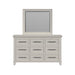 The Canterbury Dresser and Mirror Set exudes timeless elegance with its sleek smooth finish on rich veneer, blending modern and classic design. The ball bearing drawer glides ensure smooth, quiet operation, while refined brushed nickel handles add sophistication. Stylish inset panel fronts and sophisticated beveled edges enhance visual appeal, making this set a stunning focal point in any bedroom. The graceful beveled mirror completes the ensemble, adding charm and functionality. The Canterbury Dresser and Mirror Set perfectly combines functionality and elegance, bringing style and luxury to your living space.