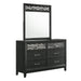 The Obsidian 6-Drawer Dresser is a perfect embodiment of modern luxury and practical design, making it an ideal addition to any sophisticated bedroom. This dresser is expertly crafted from premium solid Rubberwood, enhanced with manufactured woods and veneers, ensuring both lasting beauty and the durability of genuine wood. Its sleek, clean lines are accentuated by a chic, low-sheen black finish that exudes bold elegance and refined style. The dresser's design is further elevated by geometric cut-outs backed with mirror-like Mylar, adding a touch of luxury and modern glamour to the piece. Functionality is not compromised for style; the dresser features six spacious, smooth-gliding drawers equipped with durable Kenlin Glides and stylish acrylic drawer pulls. Each drawer is meticulously crafted with quality dovetail joinery and finished interiors, providing a snag-free, elegant storage solution for your clothing and accessories. The Obsidian 6-Drawer Dresser is the perfect blend of fashion and function, offering ample storage space while enhancing the aesthetic appeal of your bedroom.