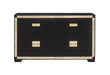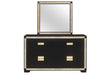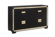 The Blake collection combines style and elegance with many beautiful features. The collection is outlined with gold colored crushed crystal to highlight its unique design. The Bed has a tall headboard and two lights along with quilted padding. The lights add style, design and function which can be used as reading lights. The quilted padding complements the design and adds comfort. All the other pieces have the black finish and crushed gold crystal outline complemented by the black and gold hardware.