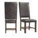 The Gramercy Tall Back Side Chair Set will look great in your dining room! These chairs feature a faux leather upholstered seat and back in a rich, chocolate color. The faux leather is distressed, instantly adding character and charm to this chair duo. Slate, nail head trim outlines the back and seat of the chairs, instantly adding extra flair to this already stylish set. The foam cushion seat and back will keep you plenty comfy during even the longest of dinners. The natural wood grains and warm, walnut finish complete the look.