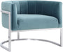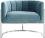 Trendsetting colors and metal detailing make the Magnolia Chair the new must-have. Fabulously chic from any angle, the magnolia will no doubt dazzle in any room. Available in multiple velvet color options with steel frame.