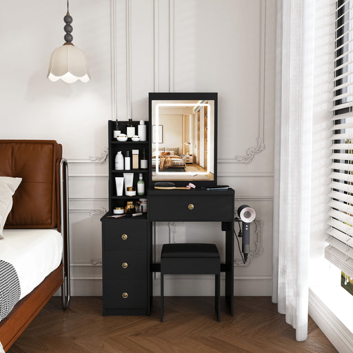 Vanity Desk With 3 LED Lighting Modes, 4 Drawers, Open Shelves, Hair Dryer Holder & Power Socket Dressing Table Set With Chair - Black