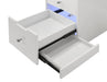 Step into a world of glamour with this sleek and chic vanity set, a perfect fusion of functionality and fashion. Its glossy white finish and clean lines are complemented by the sparkle of crystal-like knobs, adding a touch of sophistication to your personal space. The spacious tabletop, graced with a large mirror surrounded by radiant lights, offers an ideal stage for beauty routines, ensuring flawless makeup application under impeccable lighting. With a variety of drawers, this vanity provides ample storage to keep essentials organized and within reach. Interior drawer lighting, integrated outlet, and hidden drawer storage are just some of the included features.