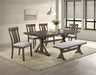 Bring rustic elegance to your dining space with this stunning farmhouse-inspired dining set, designed for both style and functionality. The beautifully crafted table features a robust trestle base, adding character and durability, while its rich wood finish enhances the natural charm of your home. The matching chairs and bench showcase a sleek slat-back design with plush upholstered seating, ensuring comfort for every gathering. Perfect for casual family meals or formal entertaining, this collection effortlessly blends rustic warmth with contemporary sophistication, making it a timeless centerpiece for any dining room.