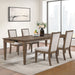 The Mariana Wood Dining Room Set is a masterful combination of timeless elegance, durability, and comfort. Crafted from solid Rubberwood, premium manufactured woods, and authentic Acacia wood veneers, the set captures the natural beauty of wood with enduring strength. Each piece features an artisanal multi-step finish in vintage Mocha, with hand-distressed details like rasping, clefting, and threading for a richly textured, time-worn appearance. The generously sized table, with its included 18" leaf, expands from 78" to 96", comfortably seating up to 8 guests. Thoughtfully designed storage drawers in the apron add convenience by keeping utensils within easy reach. The chairs, upholstered in soft, high-density foam cushions with premium polyester fabric, offer luxurious comfort for extended gatherings. Combining traditional elegance, rustic charm, and Colonial craftsmanship, this heirloom-quality dining set is perfect for elevating any dining space with warmth and style.