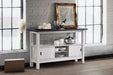 - Rustic, Farmhouse Finish: The Server has a dark brown top with a smooth finish, providing a modern contrast to the rustic design. The cabinet base is painted white and slightly distressed, enhancing the farmhouse appeal and adding character.