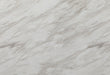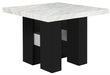 White Faux marble counter table design with an extra thick top and a double pedestal base with silver connectors.
