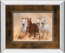 Experience the untamed energy and grace of wild horses captured in motion with this striking piece. Five horses surge forward through swirling dust, their powerful strides and flowing manes embodying freedom and vitality. Set within a sleek mirrored frame and double-matted in rich brown tones, this artwork combines traditional elegance with a modern edge. The premium real glass protects every vivid detail, while the horizontal orientation makes it a perfect centerpiece for living rooms or offices. Ready to hang and crafted for lasting beauty, it brings a dynamic spirit and timeless style to any space.