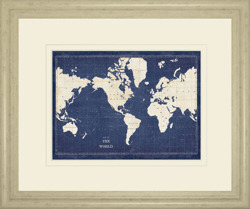 Blueprint World Map V2 By Sue Schlabach Mirrored Frame - Blue