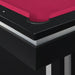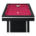 The Ajax Billiard Table is the centerpiece of your game room. This table is constructed with black laminate veneer that surrounds the table and has accents of a white laminate stripe for a modern look. Taking it a step further, the burgundy table felt provides fresh update to the standard green table felt. Six molded pockets, line outer edge of the table for game play. Included with the table are one set of billiard balls, cue ball, felt brush and racking triangle. So, call your family and friends over for an exciting game of eight ball!