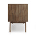 - Mid Century design includes dark brown accent detail and discreet cut out door handles