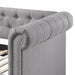 - Design and Material: This daybed features a Chesterfield shape with a fully padded design, upholstered in fabric. It includes button tufted detailing and nailhead trim in a nickel finish, enhancing its elegant appearance. The daybed is supported by wooden round legs with a black finish.