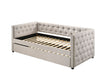 - Design and Material: This daybed features a sophisticated design with button tufting and nail-head trim accents, crafted from a combination of wood, composite wood, upholstered fabric, rubber wood, poplar, and MDF. The elegant color adds a touch of luxury to any room.