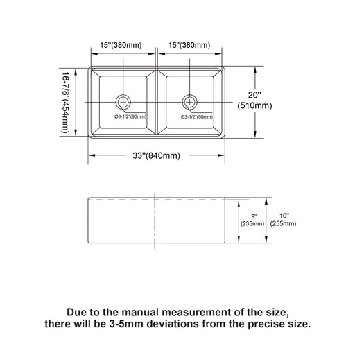Double Bowl Undermount Kitchen Sink 16 Gauge 33" X 19" With Dual 10" Deep Basins - Gunmetal Black