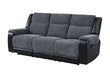 Experience ultimate comfort with the U5914 Dark Grey Reclining Collection by Global Furniture USA. This plush collection includes a reclining sofa, console reclining loveseat, and a glider recliner, all upholstered in a sophisticated two tone dark grey fabric. Each piece features generously padded cushions, supportive headrests, and easy-to-use reclining mechanisms, ensuring a relaxing seating experience. The console loveseat offers built-in cupholders and storage, while the glider recliner delivers smooth gliding motion for added relaxation. Elevate your living space with this cozy, stylish, and functional collection.