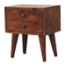 - Mini Chestnut Modern Nightsand - Endlessly versatile, this mini nightsand table makes a perfect stand for nibbles, drinks, or a lamp and will prove handy all over your home. It is made from 100% solid mango wood in a chestnut finish and features 2 drawers. Other features include shiny knobs on the drawers and 4 Nordic-style legs.