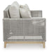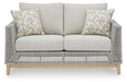 This loveseat invites your casual contemporary style outdoors. With its resin wicker in a chic neutral hue, it expertly marries refined design with durability. Breezy summer mornings and cold winter nights are made all the more comfortable with high-performance Nuvella+ fabric covering the cushion.