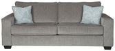If style is the question, then this sofa is the answer. Sporting clean lines and sleek track arms, the decidedly contemporary profile is enhanced with plump cushioning and a chenille-feel upholstery that's so pleasing to the touch. Sure to play well with so many color schemes, this sofa in richly neutral alloy includes a pair of understated floral pattern pillows for fashionably fresh appeal.