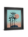 Step into a tranquil tropical evening with this captivating artwork that features the delicate silhouettes of palm trees standing tall against a soft pastel sky. A warm, peachy sun sets behind distant mountains while birds glide peacefully, evoking a serene coastal atmosphere. Encased in a sleek midnight aura frame with crystal-clear glass, this piece adds a refined touch of nature's calm to any living room or bedroom. Crafted with premium materials and ready to hang, it effortlessly blends contemporary style with soothing coastal vibes, making it a perfect centerpiece for your home decor.