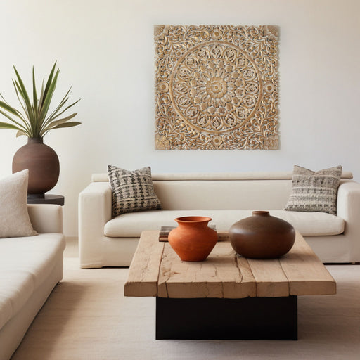 Floral Hand Carved Mandala Square Wall Decor With Spiritual Symbolism - Gold / White
