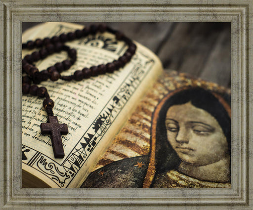 Classy LivingThis evocative framed wall art captures a serene moment of spiritual reflection with a close-up photograph of a rosary resting gently on the open p...