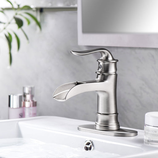 Waterfall Spout Bathroom Faucet With Single Handle And Pop Up Drain - Brushed Nickel