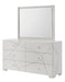 Transform your bedroom into a contemporary sanctuary with this sophisticated and stylish furniture ensemble. Defined by its bold geometric accents and pristine high-gloss white finish, this collection exudes modern elegance while maintaining a clean, minimalist aesthetic. The centerpiece bed is enhanced with a dramatic LED-lit headboard, adding ambiance and a touch of luxury to your space. Coordinated storage pieces, including a dresser, chest, and nightstands, provide ample organization while showcasing sleek hardware and clean lines. Perfect for creating a cohesive and serene atmosphere, this bedroom group offers the perfect blend of form and function, making your retreat as stunning as it is practical.