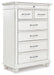 Dale a tu retiro un encanto vintage con este cofre. Con un hermoso acabado encalado desgastado, incluye siete cajones de distintos tamaños para un guardarropa organizado. Las molduras generosamente escaladas de arriba a abajo, junto con patas tipo moño y manijas de cajones con una estética transicional, le dan carácter a esta cómoda, evocando la sensación de una pintoresca escapada a una cabaña.