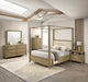 This bedroom set is a harmonious blend of rustic charm and modern simplicity, ideal for creating an inviting and warm atmosphere. The set features a stunning canopy bed as its centerpiece, which boasts a clean-lined frame and a natural wood finish that exudes understated elegance. The bed's headboard, with a gentle fabric inset, offers a soft contrast to the wood, providing a cozy backdrop for restful nights. Complementing the bed are a spacious dresser with a matching mirror and a convenient nightstand, each piece echoing the bed’s minimalist design and warm wood tones.