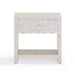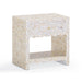 The Piara Nightstand is wrapped in hand-laid mother of pearl, its surface catching light with an opalescent glow that feels both airy and rich. Detailed with a scalloped edge and a smooth-glide drawer, this artisanal piece blends natural shell shimmer with soft, sculptural lines.