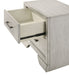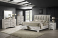 This bedroom set offers a sleek and stylish update to any space, featuring a white mist finish that commands attention while maintaining a sense of warmth and coziness. The bed stands as the stunning centerpiece, with its high, padded headboard upholstered in a plush fabric that invites relaxation and comfort. Flanking the bed are matching nightstands, providing convenient access to storage and display space. The set is rounded out with a capacious dresser, accented with a broad mirror that adds depth and brightness to the room.