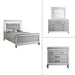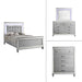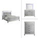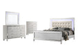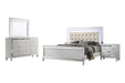 The Valentino Bedroom Set is an opulent collection designed to transform your bedroom into a glamorous retreat. This set includes a bed with touch lighting, a dresser, a lighted mirror, and two nightstands, all meticulously crafted from a durable combination of manufactured and solid woods with decorative embossed inlays for long-lasting quality and distinction. The bed features a crystal button-tufted padded headboard, a gleaming finish, mirrored trims, and alligator embossed inlays, evoking an unparalleled Hollywood glam appeal. Soft LED lighting in the headboard and dresser mirror provides ambient illumination, creating an intimate and luxurious atmosphere. The nine-drawer dresser offers ample storage for clothing, while the three-drawer nightstands conveniently hold your bedside essentials. This exquisite bedroom set combines extravagant style with exceptional craftsmanship, bringing a touch of star quality to your contemporary bedroom suite.