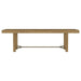 This dining table blends modern refinement with functional design, featuring a trestle base with a metal stretcher bar that adds a contemporary industrial touch. The rounded corners soften the clean lines of the rectangular tabletop, creating a welcoming aesthetic. A removable 18-inch leaf extends the seating capacity, while smooth equalizing metal cable glides ensure effortless, single-person operation. Crafted from solid rubberwood, white ash veneer, and metal, this table offers durability and style for any dining space.