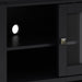 - Features two (2) sliding tempered glass doors that open to a cabinet with two (2) adjustable shelves