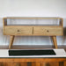 - Artisan Furniture Solid Wood Curved Media Unit - Our solid timber media unit is expertly constructed from 100% solid mango wood in a lovely finish. This modern design offers clean, curved edges and features 2 drawers that come with a shiny knob, a large open slot to place any books, photo frames, ornaments, and 4 Nordic style legs.
