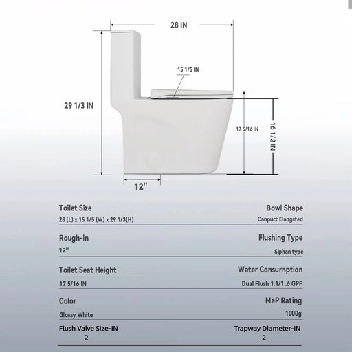 Glossy Tornado Flush 1 Piece Toilet With Dual Flush, Soft Close Seat - Gloss White