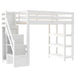 Full Size Loft Bed With 4 Layer Shelves, Storage Staircase, Small Wardrobe, LED Light - White