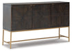 Este gabinete decorativo es una maravilla versátil con 3 frentes de puerta con estampado geométrico en cálido marrón oscuro acentuados con herrajes metálicos con acabado en tono dorado. Ubicada sobre una base de marco abierto de metal dorado, la consola de tres puertas es estéticamente contemporánea y sofisticada, lista para servir como buffet, consola o mueble multimedia.