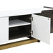 - Modern & Elegant Design:The TV cabinet and coffee table set feature a striking contrast between white surfaces, classic wood grain, and gold details. The sleek metal L-shaped frame and clean lines create a sophisticated.