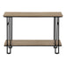 - Design & Finish: This 2-tier console table features a stylish wood-look finish on both the tabletop and bottom shelf, complemented by a contrasting metal base with open, U-shaped legs and decorative H-frame sides.