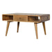 - Curved Oak-ish Coffee Table - This Coffee Table has a modern and clean design with it's rounded edges. It has been constructed from 100% Solid Mango Wood in a rich, oak-ish finish. Some features include 2 drawers which has a shiny knob and 2 open slots to place any books, photo frames, ornaments etc and 4 Scandinavian style legs.
