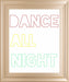 Celebrate the joy of movement with this vibrant framed wall art piece that boldly declares "Dance All Night." Featuring colorful, outlined typography in soft coral, sunny yellow, and mint green, this artwork brings a playful and uplifting energy to any room. The light wood frame adds a warm, natural touch, perfectly complementing the bright graphic design. Ideal for living rooms, studios, or offices, this ready-to-hang piece invites you to embrace positivity and rhythm every day, making your space feel alive and inspired.
