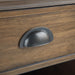 - Rustic design includes tapered legs, grooved sides, molded crown edged table top and vintage style bronze drawer pulls
