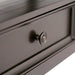 - Transitional style includes elegantly tapered legs, molded crown edged table top, panel framed drawer fronts, metal drawer glides and Antique Pewter round decorative knobs