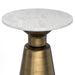 - Hand-finished Metal base in an Antique Brass finish with a White Marble round tabletop.