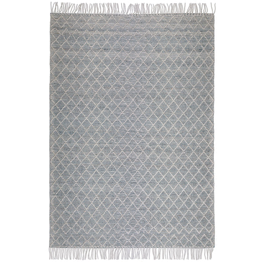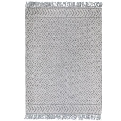 - Detailed with a woven pattern in cream beige and grey featuring a hand-knotted fringe