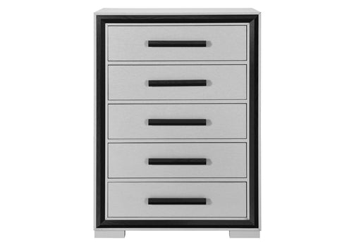 The Amelia Chest by Global Furniture USA is the epitome of vertical storage sophistication. This tall chest is a space-saving marvel, offering generous storage within its drawers without sacrificing style. Like the other pieces in the collection, it features the eye-catching silver finish and black accent trim that define the Amelia line. The sleek black drawer pulls ensure a seamless operation and contribute to the chest's sleek appearance. Whether you're storing away sweaters, linens, or accessories, the Amelia Chest is an ideal solution for maintaining an organized and elegant bedroom.